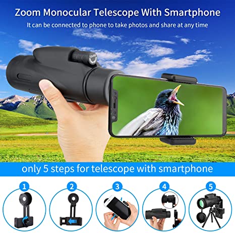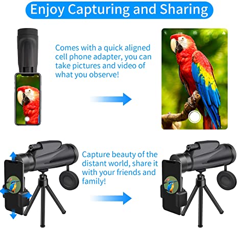 • ✨【Monocular Widely Compatible for Smart phone】:Comes with the newest quick alignment phone holder and high quality tripods.Perfect for i-Phone X/ i-Phone 8/8 plus, 7/7 plus, 6/6s plus, Sam-sung GA-LAXY S9/S9 Edge, S8/S8 Edge, S7/S7 Edge, and almost all other smart phones on the market.Super easy to install, provide HD photo and video to share with your friends, and a good candidate for your travels.